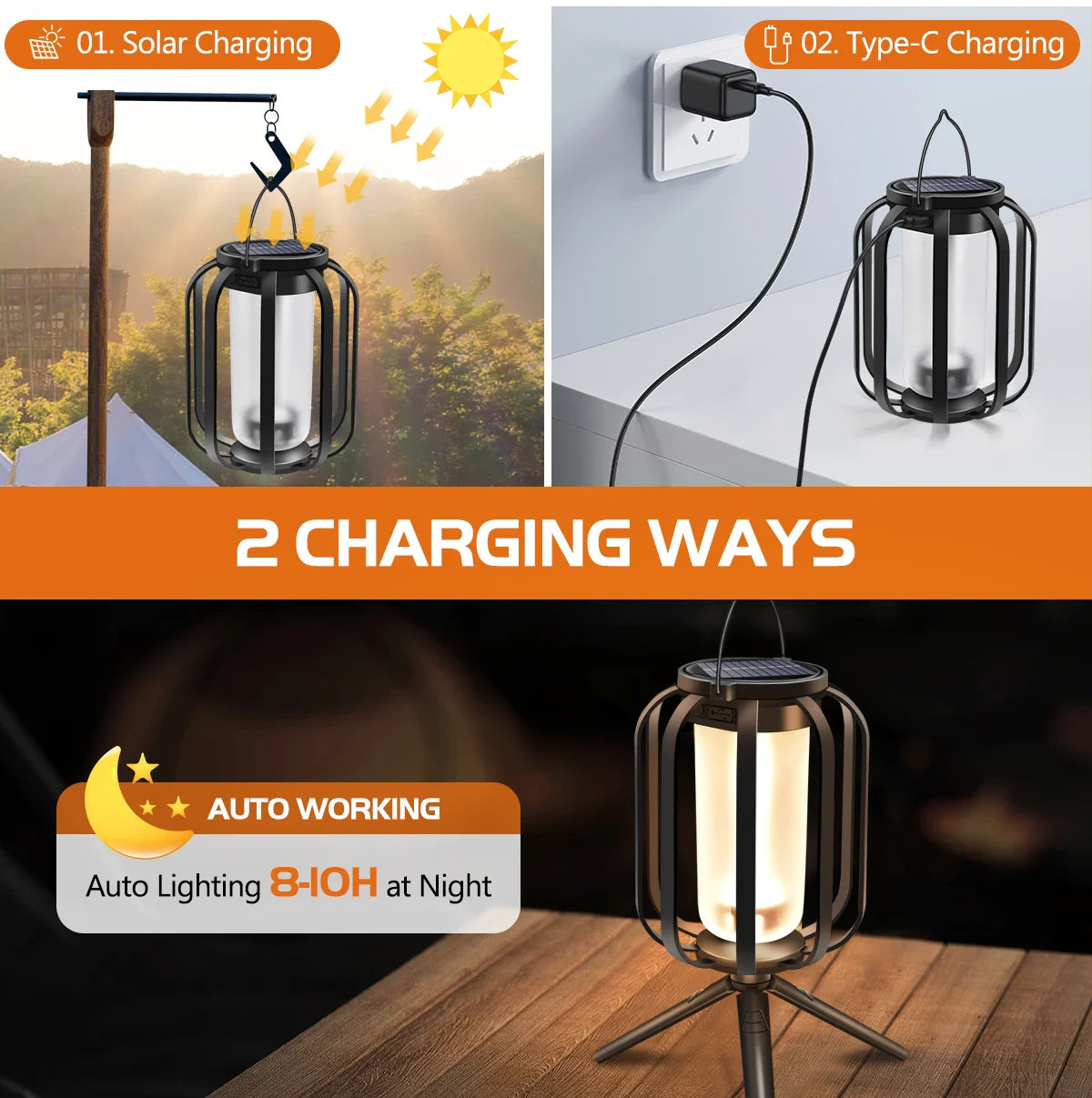 Charge via solar power by day or USB for quick power-ups. No batteries to replace—just easy, eco-friendly energy.